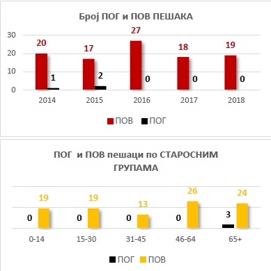 U prethodnih pet godina na teritoriji Republike Srbije (od 2013. do 2017. godine) poginulo je 742 pešaka, dok je povređeno 14.466 pešaka. Drugim rečima, u proseku, svake nedelje pogine po tri pešaka, a svakog dana bude povređeno oko 8 pešaka. Kada se posmatra zastupljenost različitih učesnika u saobraćajnim nezgodama, četvrtina svih poginulih lica su pešaci i šestina svih povređenih su pešaci. Najugroženija starosna kategorija pešaka u saobraćaju u Srbiji su stariji od 65 godina, jer polovina svih poginulih pešaka je ove starosne kategorije.