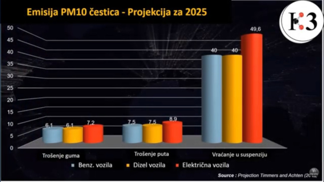 Kad smo već kod habanja i trošenja pneumatika, trebamo obratiti pažnju na ovaj grafik koji nam ilustruje zagađenje od PM10 čestica, gde vidimo da električna vozila prednjače u odnosu na bezince i dizelaše.