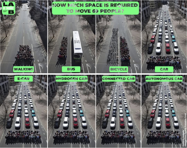 Ovde treba uključiti činjenicu da je prosečni automobil parkiran 95% vremena, što ukazuje na neučinkovitu upotrebu prostora. Zamene SUS vozila sa električnim vozilom neće rešiti ovaj problem.