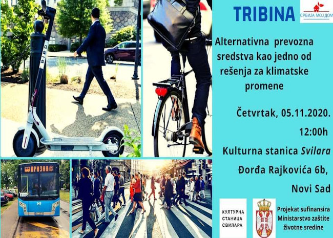 Udruženje građana ”Srbija, moj dom” u okviru projekta ”Pronađi alternativu putničkom automobilu”, koji sufinansira Ministarstvo zaštite životne sredine, organizuje tribinu pod nazivom ”Alternativna prevozna sredstva kao jedno od rešenja za klimatske promene”.