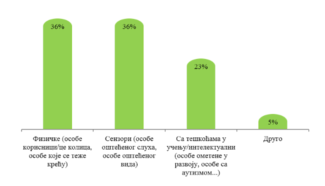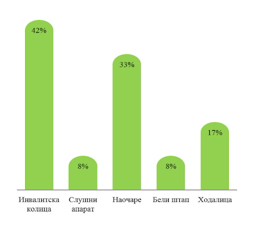 Podjednak broj ispitanika fizički (osobe koje koriste kolica, osobe koje se teže kreću) i senzorne (osobe oštećenog vida i/ili sluha) oblike invaliditeta (36%) (slika 3.). Potom slede osobe sa teškoćama u učenju (23%), ali i mali procenat osoba koje su navele da imaju neki drugi oblik invaliditeta (5% - dve osobe koje su navele da imaju multiplesklerozu). Od ukupnog broja osoba sa invaliditetom koje su popunile anketni upitinik, 55% je navelo da koristi neku vrstu pomagala, gde se posebno izdvajaju kolica (42%) i naočare (33%) (slika 4.). Od ukupnog broja, 36% ispitanika je navelo da tokom kretanja nisu samostalni, gde su uočena samo dva odgovora: sa članovima porodice (81%) i uz ličnog pratioca (19%).