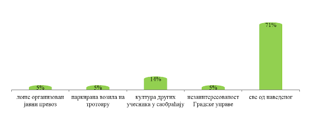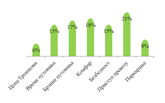Sa slike 5. se može videti da najveći procenat ispitanika, kao svakodnevni vid prevoza, bira putnički automobil (53%), a potom sledi pešačenje (35%). S druge strane, slika 6. pokazuje da kao razlog za izbor svakodnevnog vida prevoza, najveći procenat ispitanika navodi da je to pristupačnost vidu prevoza (21%), a potom slede komfor (18%) i brzina putovanja (17%); dok je najmanje zastupljen razlog vezan za troškove svakodnevnog vida prevoza (6%). Međutim, važno je napomenuti da su na ova dva pitanja ispitanici mogli da navedu više mogućih odgovora.