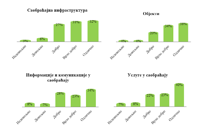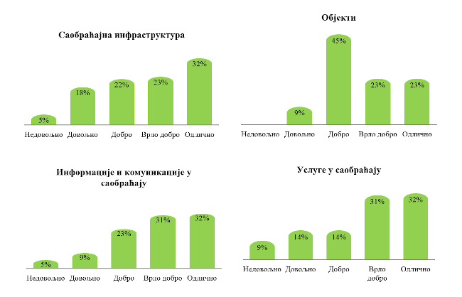 Kako bi se videlo koji su to razlozi koji bi motivisali ispitanike da se više kreću, postavljen je set pitanja u kojima su ispitanici iznosili svoje stavove putem ocena koje su prikazane skalom od pet stepeni, gde je 1 – nedovoljno; 2 – dovoljno; 3 – dobro; 4 – vrlo dobro; i 5 – odlično. Sa slike 23. se može videti da su ispitanici najviše ocene dali objektima atrakcije (kao što su ugostiteljski objekti, trgovine i rekreativni objekti) i razvoju saobraćajnih usluga, kao što su specijalne usluge javnog prevoza, aplikacije na pametnim telefonima koje omogućavaju sistem rezervacije i plaćanja. Sa druge strane, može se videti da su ispitanici svim predloženim odgovorima (saobraćajna infrastruktura, objekti, informacije i komunikacija, usluge) dali visoke ocene.