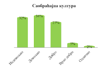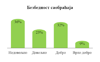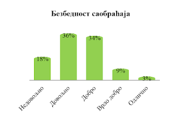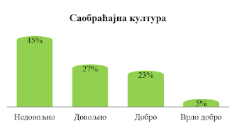 Imajući prethodno na umu, i nije iznenađenje da veliki procenat ispitanika bezbednost saobraćaja na teritoriji grada Bora ocenjuje najnižom ocenom (nedovoljno – 36%). Sa slike 12. se takođe može videti da ispitanici u velikom procentu imaju stav da je bezbednost saobraćaja uopšteno loša na teritoriji grada Bora. Pored toga, ispitanici saobraćajnu kulturu na teritoriji grada Bora takođe ocenjuju izuzetno nisko ocenom (nedovoljno – 45%) (slika 13.).
