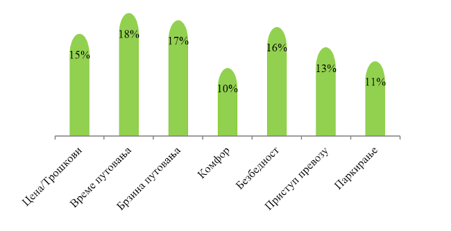 Sa slike 21. se može videti da najveći procenat ispitanika, kao svakodnevni vid prevoza, bira putnički automobil (51%), a potom sledi pešačenje (31%). S druge strane, slika 22. pokazuje da kao razlog za izbor svakodnevnog vida prevoza, najveći procenat ispitanika navodi da je to vreme putovanja (18%), a potom slede brzina putovanja (17%) i bezbednost (16%); dok je najmanje zastupljen razlog vezan za komfor svakodnevnog vida prevoza (10%). Međutim, važno je napomenuti da su na ova dva pitanja ispitanici mogli da navedu više mogućih odgovora.