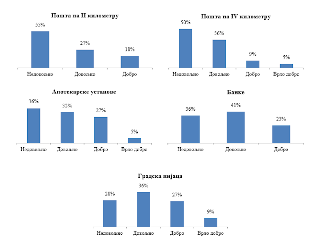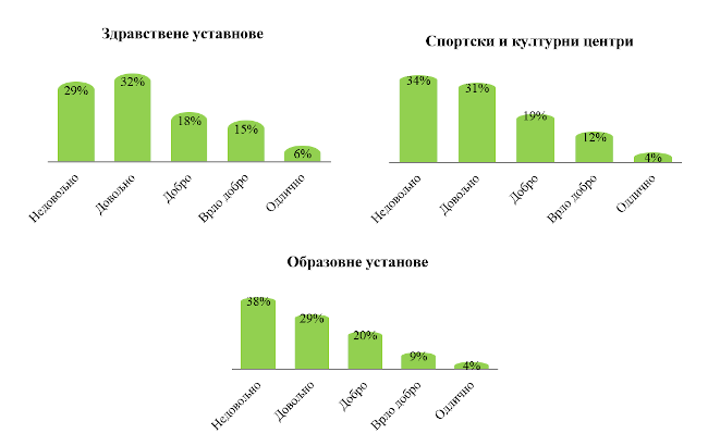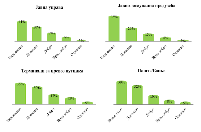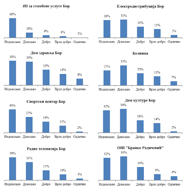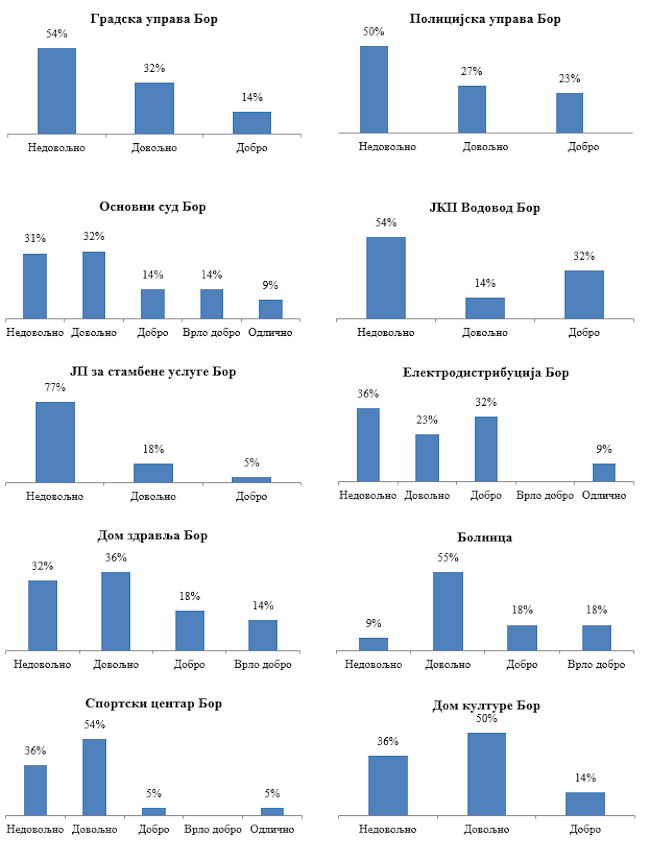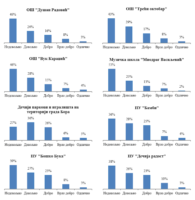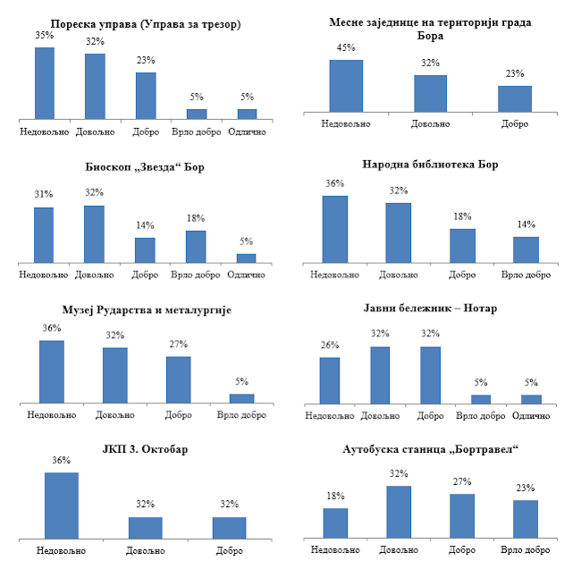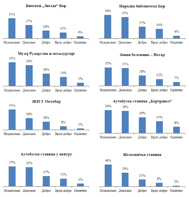 U vezi sa prethodnim slikama, pripremljena je lista objekata atrakcije u gradu Boru za koje su ispitanici navodili stavove o nivou pristupačnosti. Stavovi ispitanika za nivo pristupačnosti svakom pojedinačnom objektu su prikazani u prilogu 1., dok će u nastavku biti prikazani stavovi za objekte koji su grupisani na sledeći način: Javna uprava; Javno-komunalna preduzeća; Terminali za prevoz putnika; Pošte/Banke; Zdravstvene ustanove; Sportski i kulturni centri; i Obrazovne ustanove. Slika 10. pokazuje izrazito nezadovoljstvo pristupačnosti objektima atrakcije, kao što je to bio slučaj i na slikama 8. i 9. Međutim, može se videti da pristupačnost zdravstvenim ustanovama ima bolju ocenu stavova ispitanika za razliku od ostalih grupa, možda zbog posvećenosti potrebama osoba sa invaliditetom (rampe za kolica).