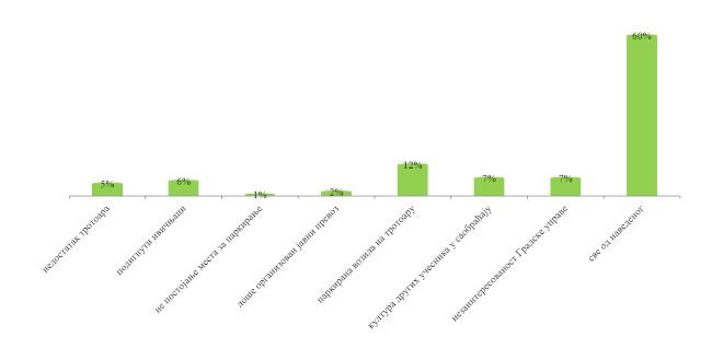 Shodno stavu velikog procenta ispitanika koji su nezadavoljni pristupačnošću objektima atrakcije u gradu Boru, u anketnom upitniku je ponućena lista mogućih problema sa kojima se grad Bor suočava, a koji se posebno odnose na osobe sa invaliditetom. Slika 27. pokazuje da najveći procenat ispitanika smatra da kombinacija svih ponućenih odgovra i jeste najveći problem u gradu Boru (60%). S tim u vezi, ovde se nalaze problemi kao što su: nedostatak trotoara, podignuti ivičljaci, nedostatak mesta za parkiranje, loša organizacija javnog prevoza, nepropisno parkiranje, kultura učesnika u saobraćaju i nezainteresovanost Gradskih vlasti. Ponovo, važno je napomenuti da su na slici 27. prikazani stavovi osoba bez invaliditeta o problemima odvijanja saobraćaja po pitanju osoba sa invaliditetom.
