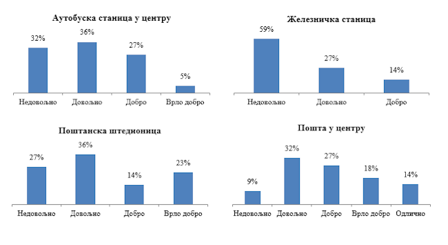 Na osnovu skale ocena od pet stepeni, ispitanici su iznosili svoje mišljenje o tome koliko je saobraćajna i urbanistička infrastrukruta u gradu Boru dostupna osobama sa invaliditetom. Sa slike 24. i 25. se može videti da su ispitanici i saobraćajnoj i urbanističkoj infrastrukturi dali veoma niske ocene. Ovde je važno napomenuti da se ovi odgovori odnose na osobe koje nemaju neki od oblika invaliditeta, tako da se mogu videti njihovi stavovi po pitanju pristupačnosti osoba sa invaliditetom.
