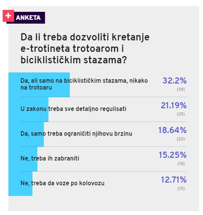 Što se tiče problema određivanje saobraćajne površine govore i rezultati ankete koju je naše udruženje sprovelo sa portalom mondo.rs. Naime, 32% ispitanika smatra da im kretanje treba dozvoliti samo na biciklističkim stazama, 19% smtra da im treba dozvoliti i na trotoaru i biciklističkim stazama ali ograničiti njihovu brzinu, dok 13% smatra da treba da voze po kolovozu. Čak 15% ispitanika smatra da ih treba zabraniti, dok 21% smtra da u zakonu treba sve detaljno regulisati.