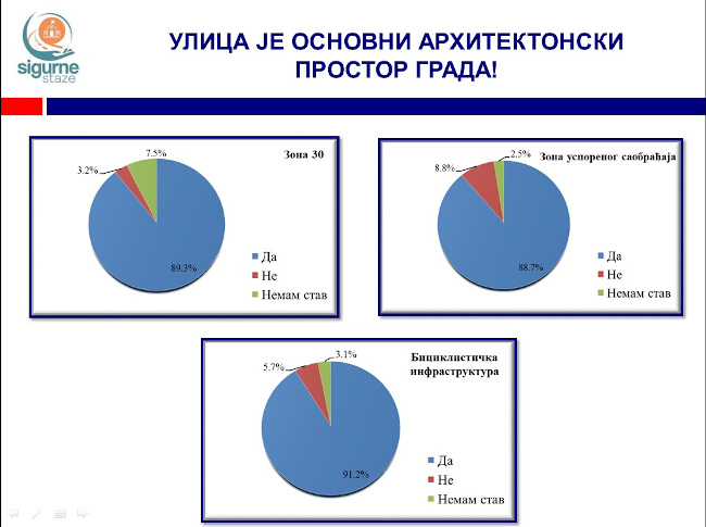 Velić je pristutnima predstavio rezultate istraživanja koje je uradilo udruženje Sigurne staze i izložio prednosti koje sa sobom nose zone 30, zone usporenog saobraćaja i biciklističke staze/trake.