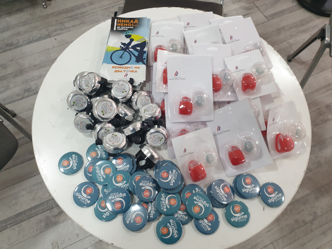 Prisutni na tribini su dobili poklone u vidu svetla i zvonca za bicikl koja je obezbedila Agencija za bezbednost saobraćaja R. Srbije, kao i knjigu Siguran smer-vodič kroz osnovna pravila saobraćaja.